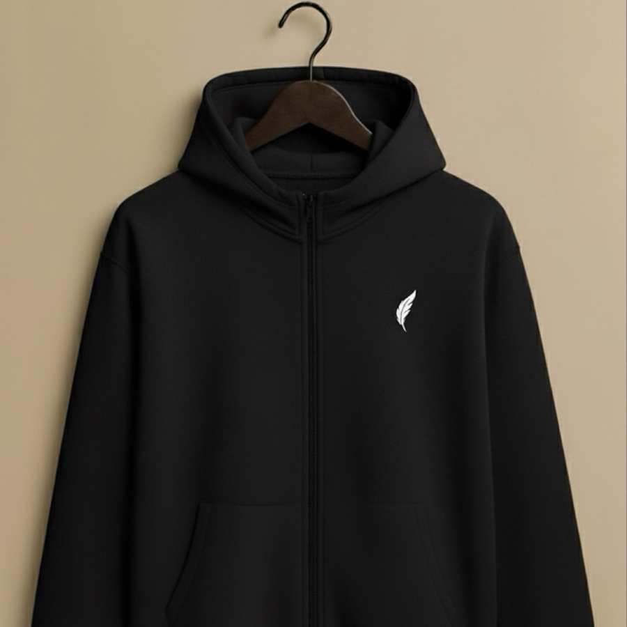 جاكيت أسود فخم بشعار الريشة، يجمع بين البساطة والأناقة والراحة اليومية